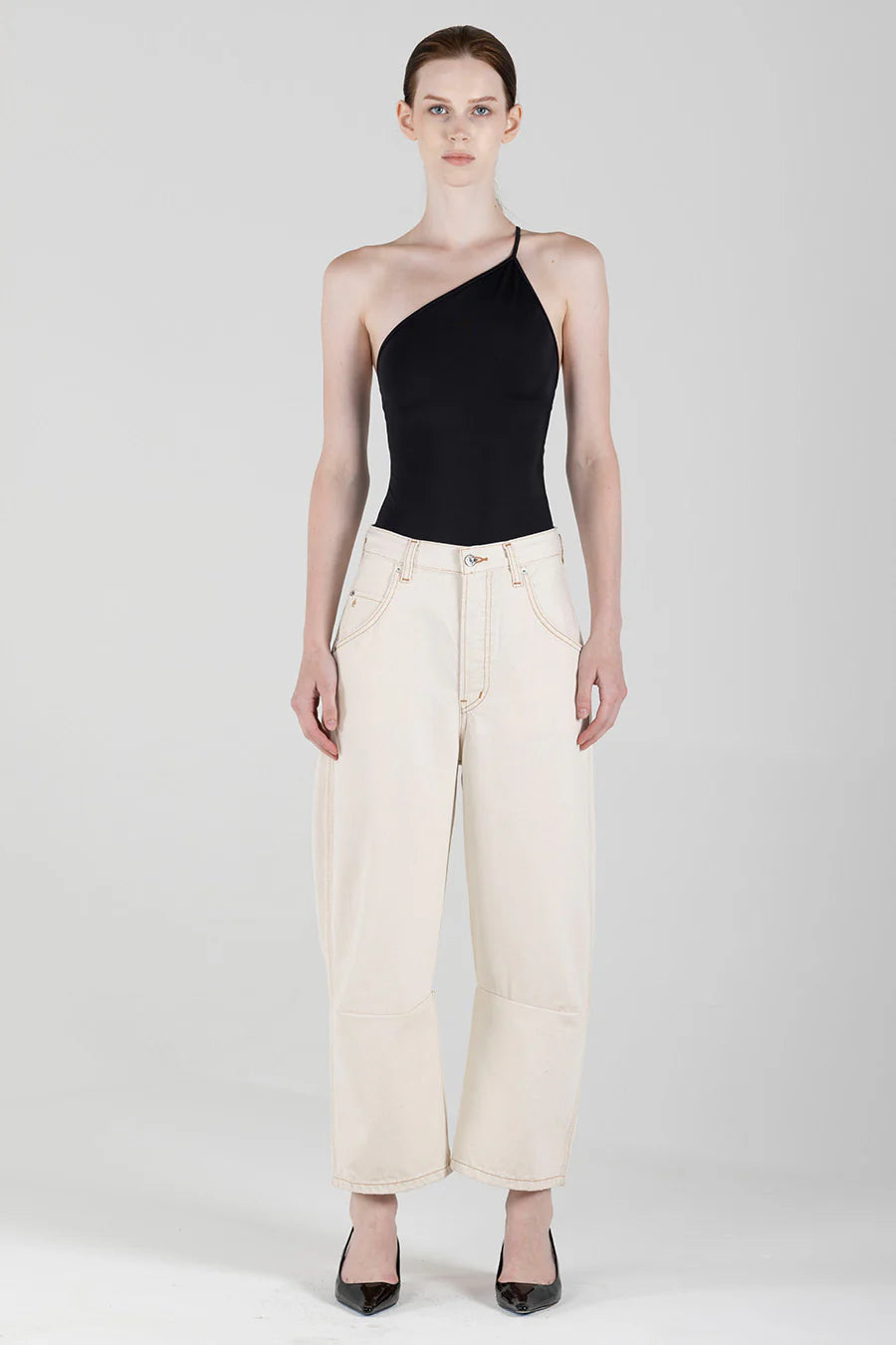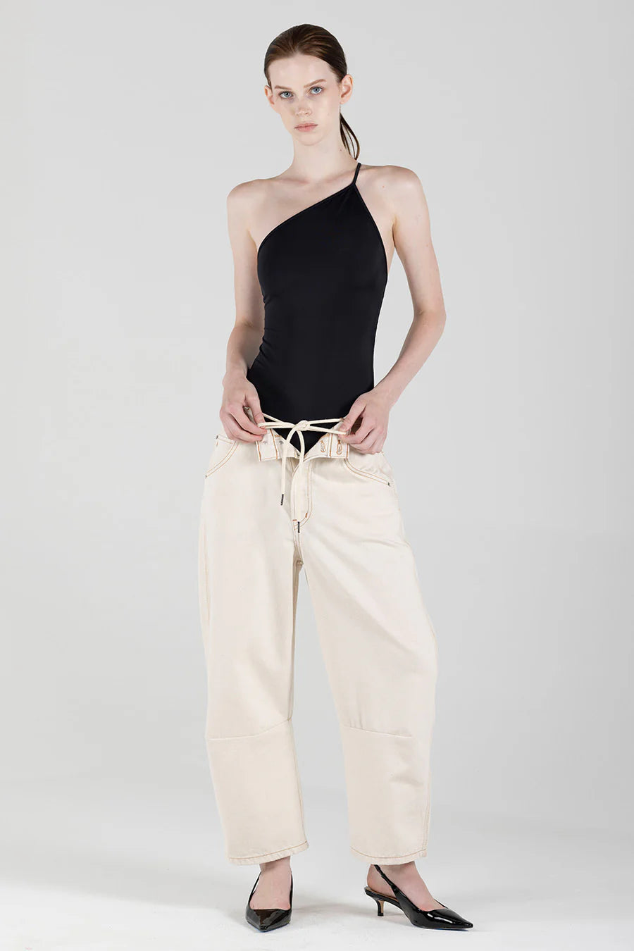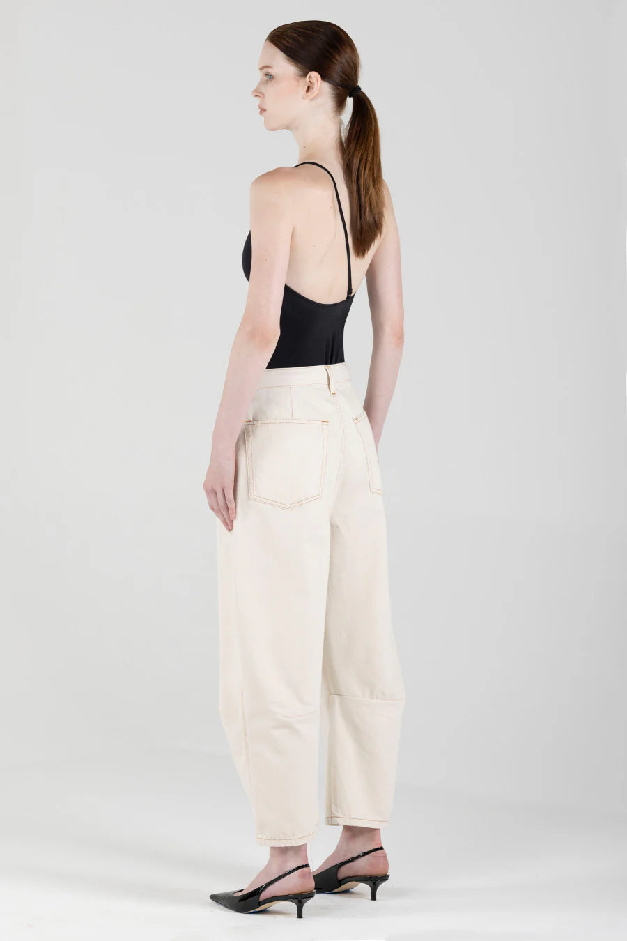 Quinn has a 13” high rise that sits easy through the hips and thigh but can be tightened with a hidden interior drawcord. It’s loose, arched leg is accentuated with an inseam knee dart. An authentic button fly and deep scoop pockets add to this a modern workwear look. An inseam of 26” and leg opening at 16” make it a perfect, versatile length for boots, sneakers or flats.