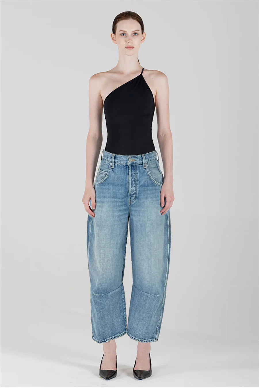 Quinn has a 13” high rise that sits easy through the hips and thigh but can be tightened with a hidden interior drawcord. It’s loose, arched leg is accentuated with an inseam knee dart. An authentic button fly and deep scoop pockets add to this a modern workwear look. An inseam of 26” and leg opening at 16” make it a perfect, versatile length for boots, sneakers or flats.